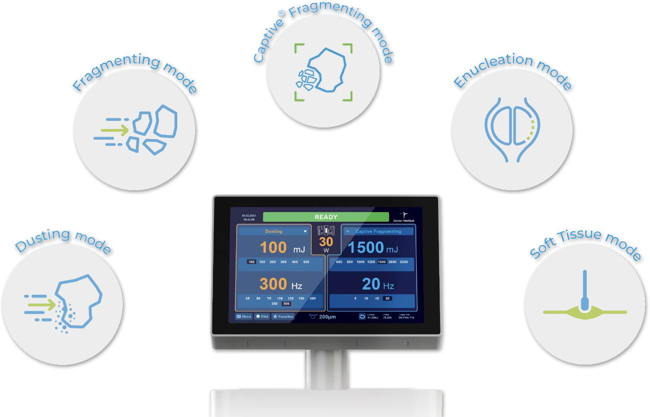 Comercializamos Lasers Holmium de 2100 nm de comprimento de onda, para o tratamento da litíase, corte e coagulação de tecidos moles (estenoses e tumores do tracto urinário).O novo THULIO ®, com tecnologia inovadora assente em Tm:YAG (estado sólido) pretende ser versátil e de elevadíssimo desempenho, quer para litíase como para HPB. Possui a maior potência de pico entre os lasers túlio, possibilitando alto desempenho na fragmentação e excelente efeito hemostático durante procedimentos como o ThuLEP.